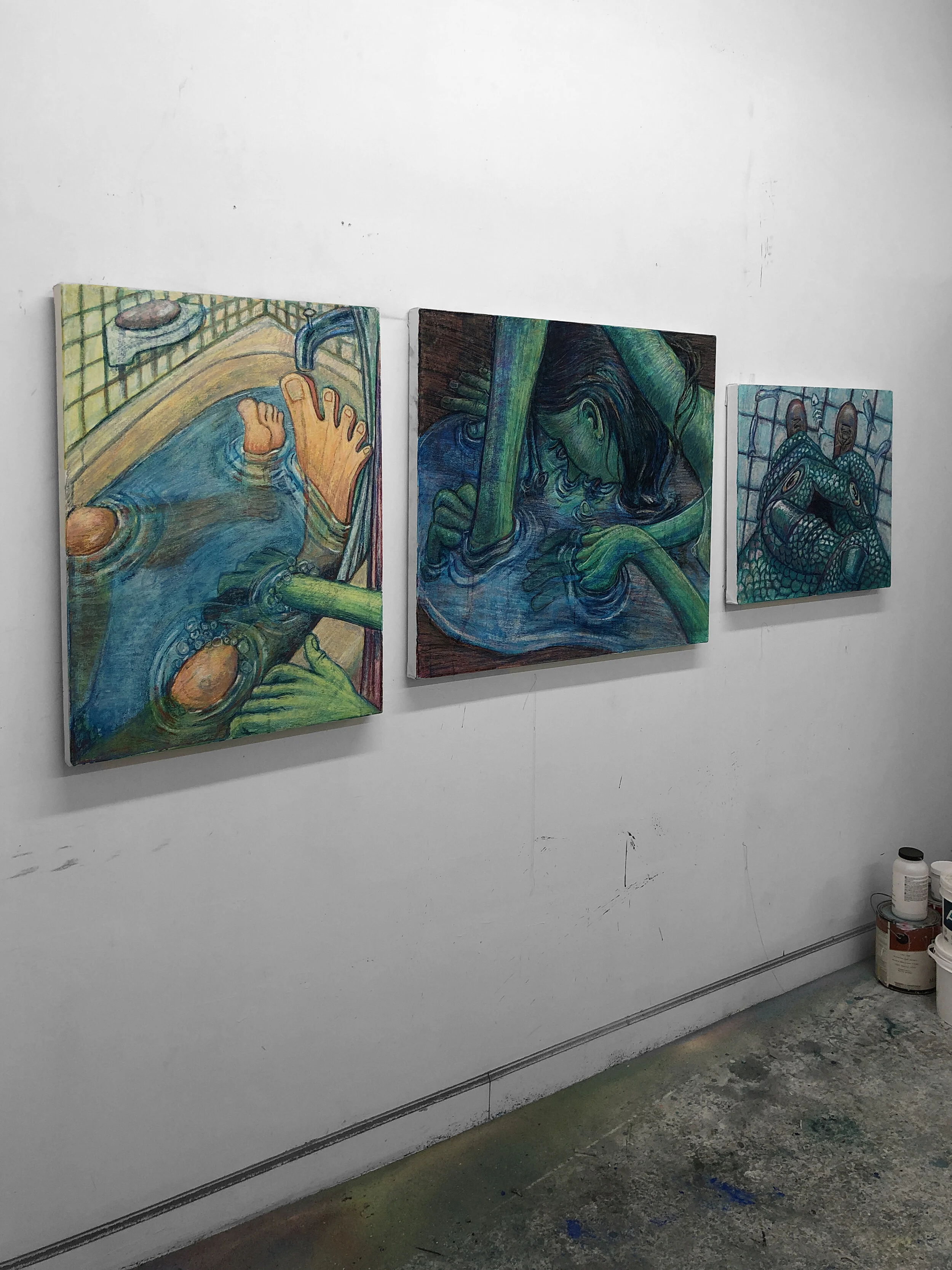 AR: I work a full time job at a hydroponic farm in Brooklyn so that is something I constantly have to balance with studio time - on weekdays I'm farming so evenings, weekends, & days off are spent in the studio. My practice is deeply research based and I do see my farm work as a part of that research, as well as my practice of reading fiction literature which is an essential part of my art making. Once my research has uncovered an idea or feeling I want to illustrate I enter the studio with momentum. I try to schedule long studio sessions because I find I work best when I have time to settle into making. If I don't have the luxury of an extended time period, I sketch, read, or write.