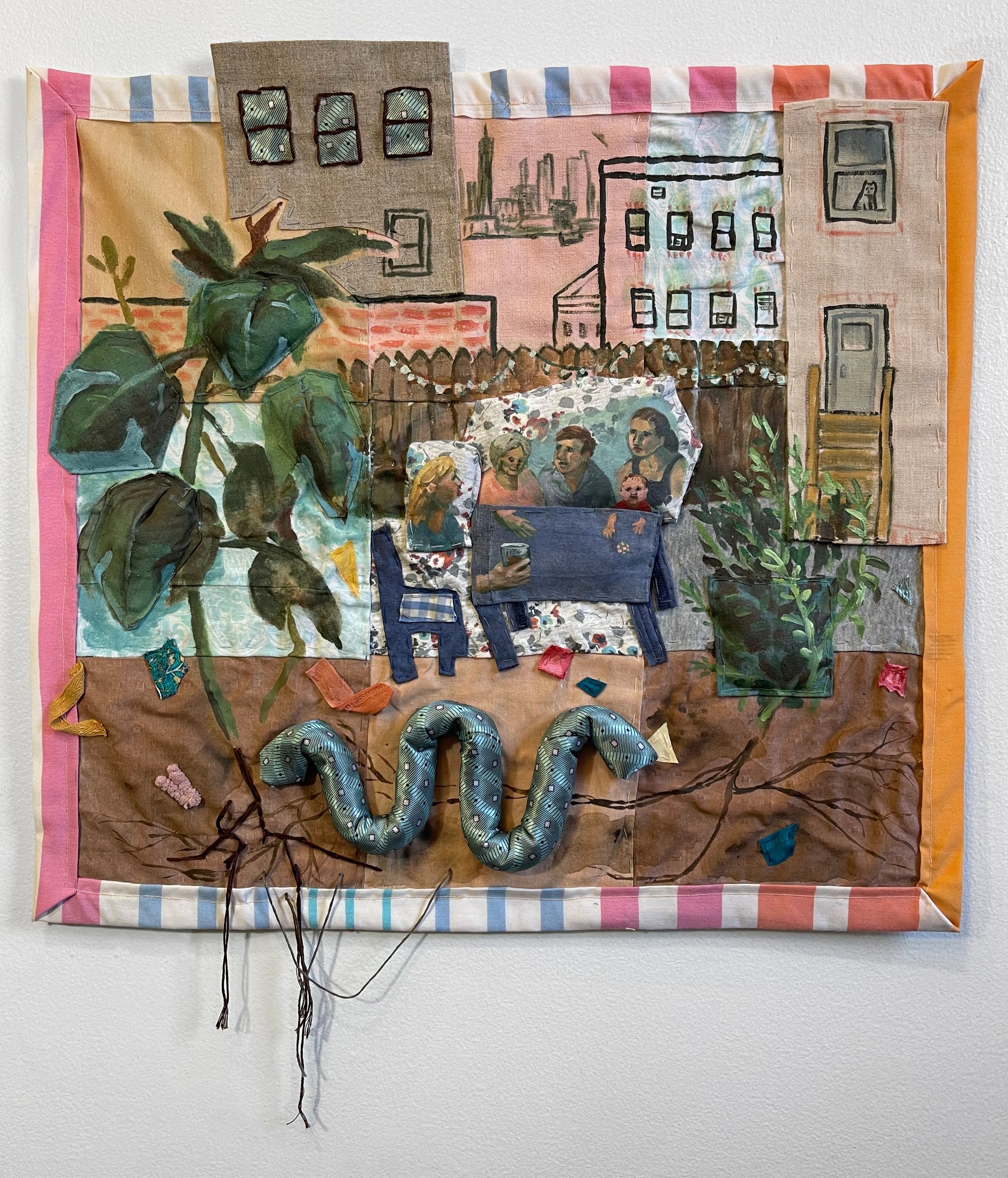 “Backyard in Summer”, 24”h x 21”w, Acrylic and embroidery on repurposed fabric, 2023