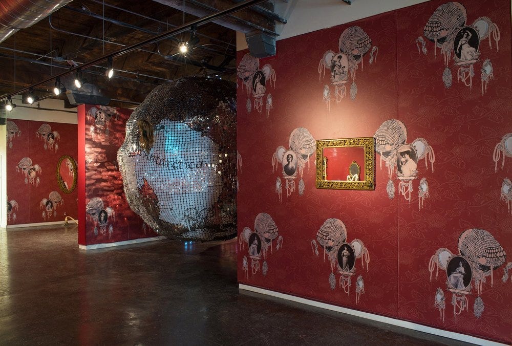 Autour de la Fin du Monde, Multi-media installation with central “disco ball” sculpture (144 x 144 inches), hand made wallpaper, and video projection with lighting elements