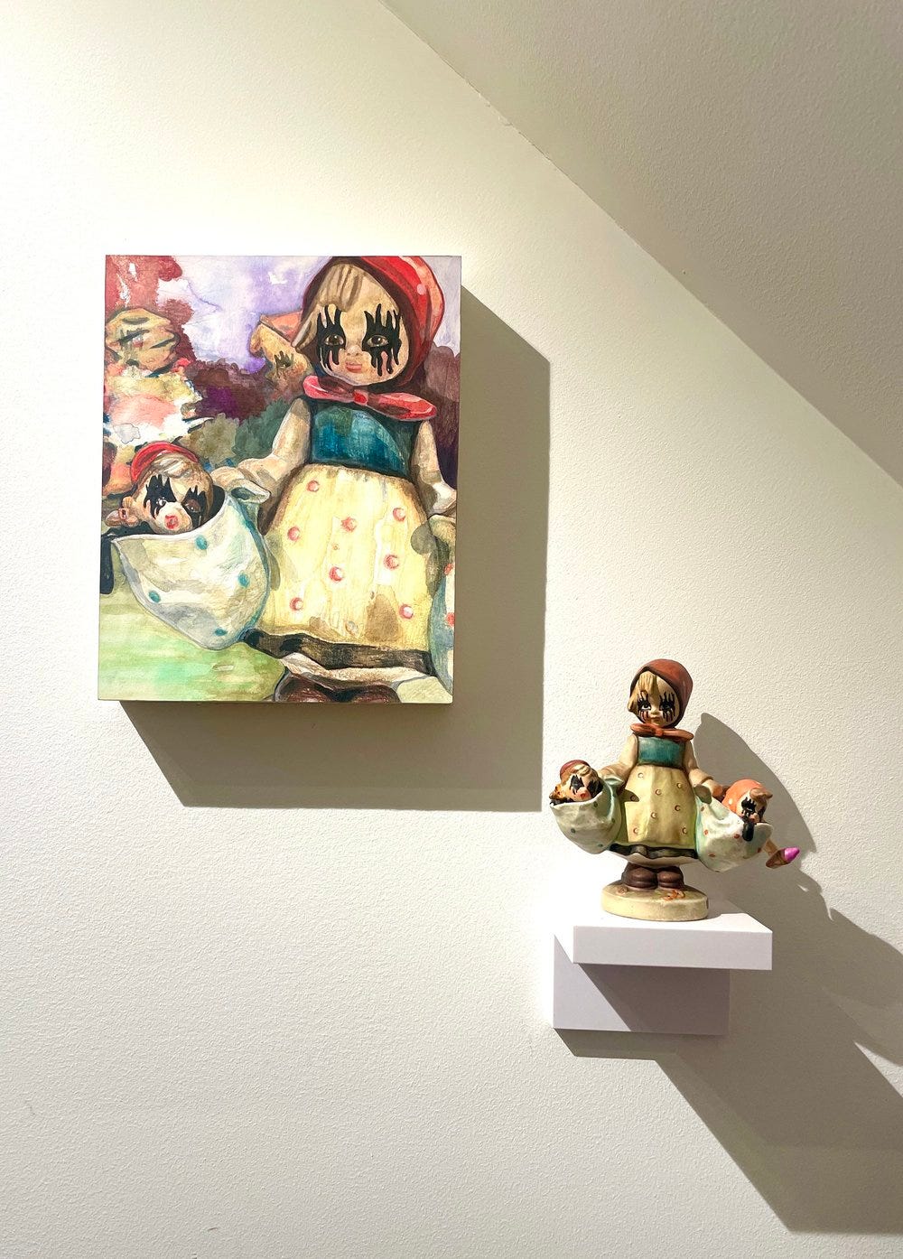 Mother’s Darling, Mixed media sculpture and watercolor painting combo, ceramic sculpture 5 x 4 x 5 inches, painting 10 x 8 inches