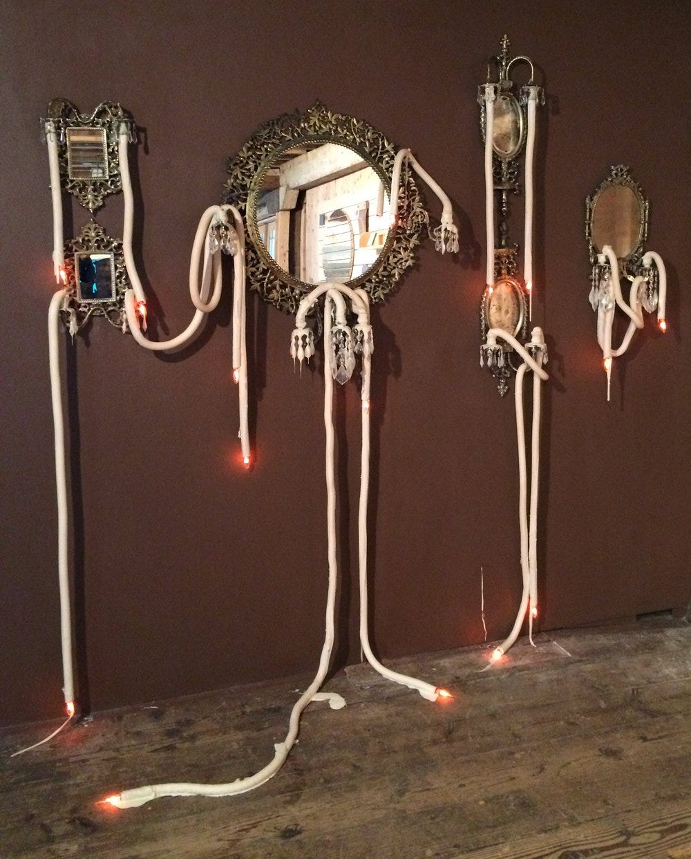 15 Bad Habits, Cast rubber, electrical elements, resin clay, chandelier crystals, antique bronze mirrors, 78 x 72 x 12 inches