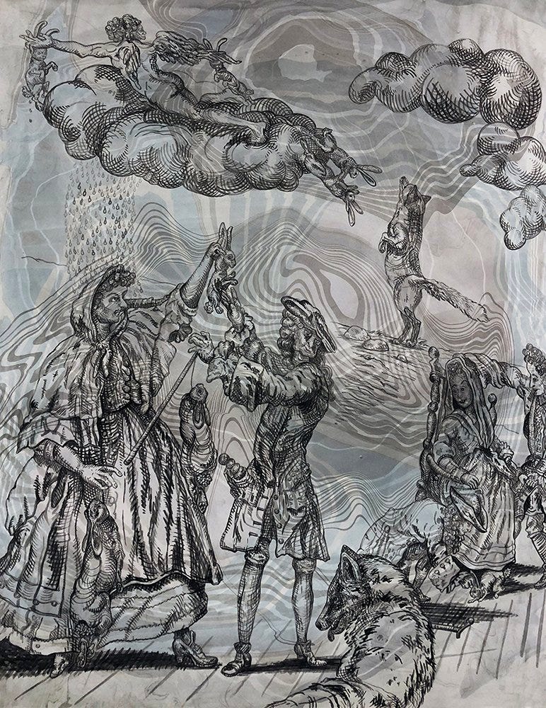 The Argument, Ink and watercolor on hand-marbled rag paper, 30 x 22 inches