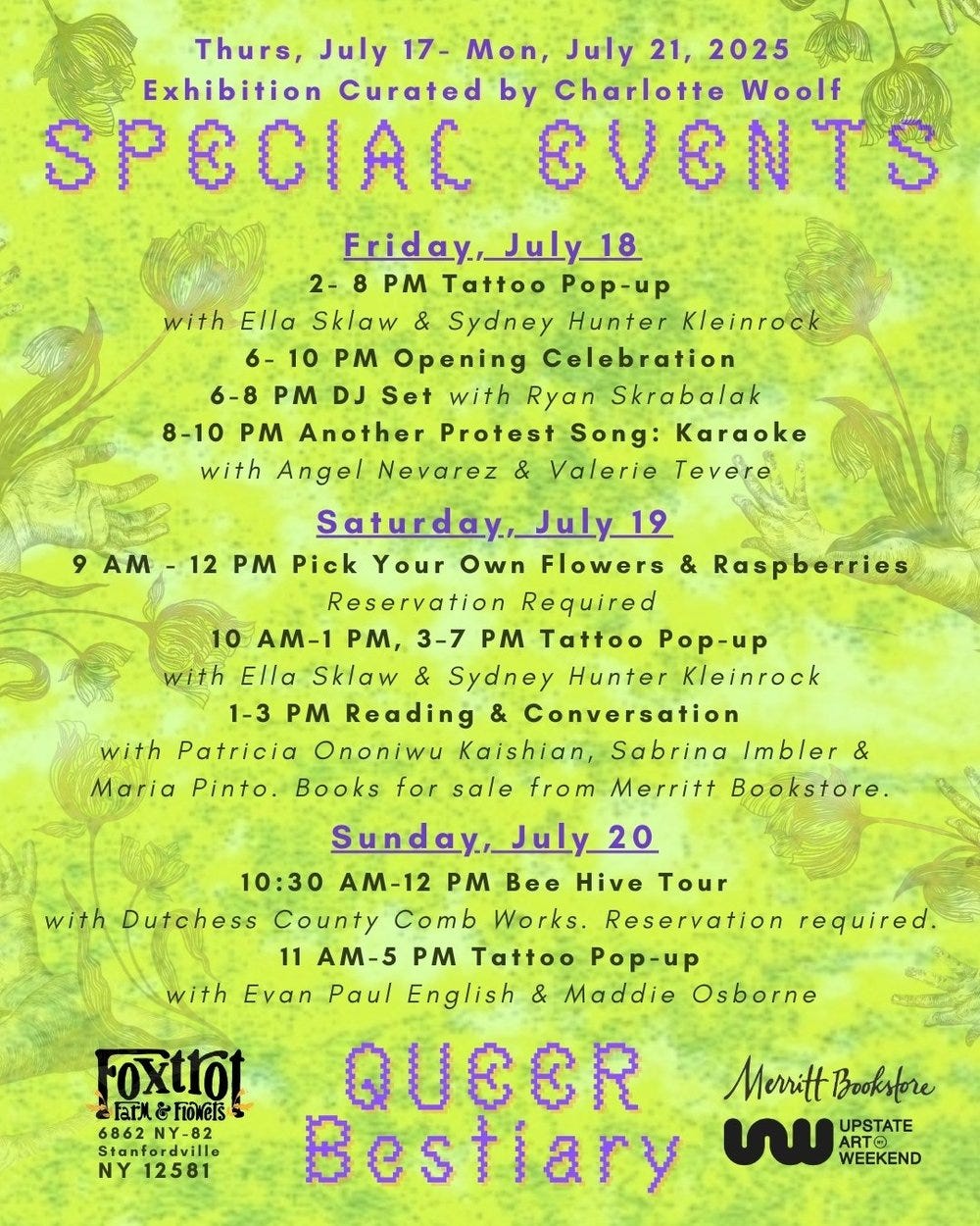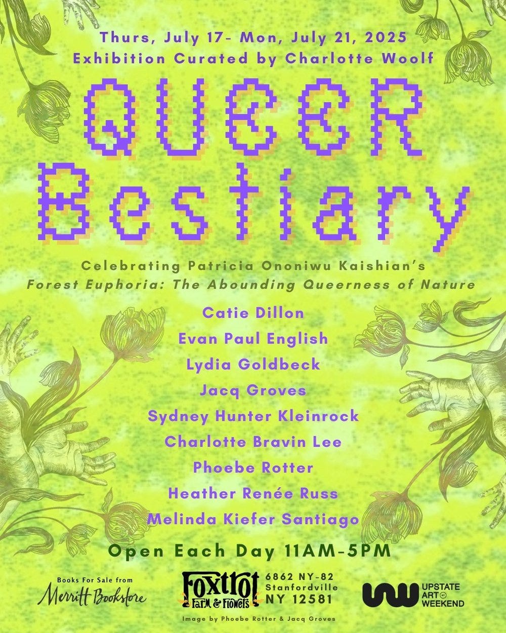 CW: Absolutely. Community is what keeps me going, both in my art practice and in life. Some of the most meaningful collaborations I’ve had have come through a mix of happenstance and persistence. For example, this year’s “Queer Bestiary” is inspired by Forest Euphoria, a book by Patricia Ononiwu Kaishian. I met Patricia when I was teaching at Kenyon College and asked around at trivia night if anyone knew a writer in the Hudson Valley who might be interested in visiting a farm for a reading. Jen Galvão, a writer and editor at the Kenyon Review, told me that Patricia was her cousin. Patricia came to Foxtrot and did a reading during “Unruly Edges” in 2024, and now the 2025 show is centered around her work.