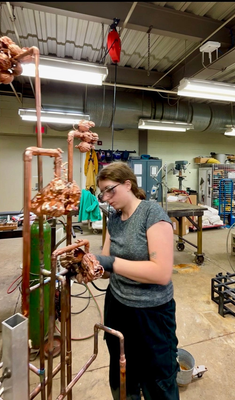 Molting in the Current, Electroformed copper pipe and steel, 27 × 27 × 96 inches, 2025 (shown installed in “Muskeg” at Mother-in-Law’s Gallery)