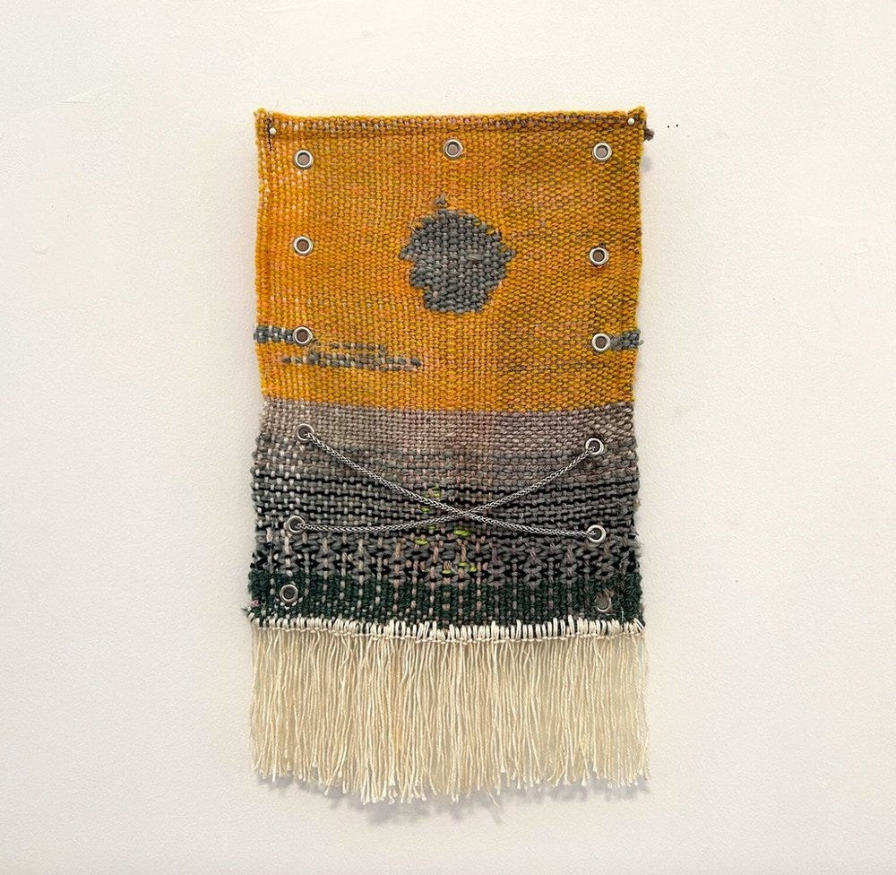 95 on 81, Found yarns and steel woven on floor loom, 12 x 18 inches, 2023