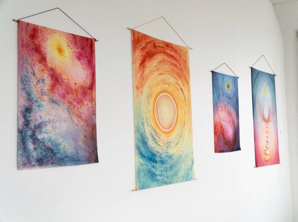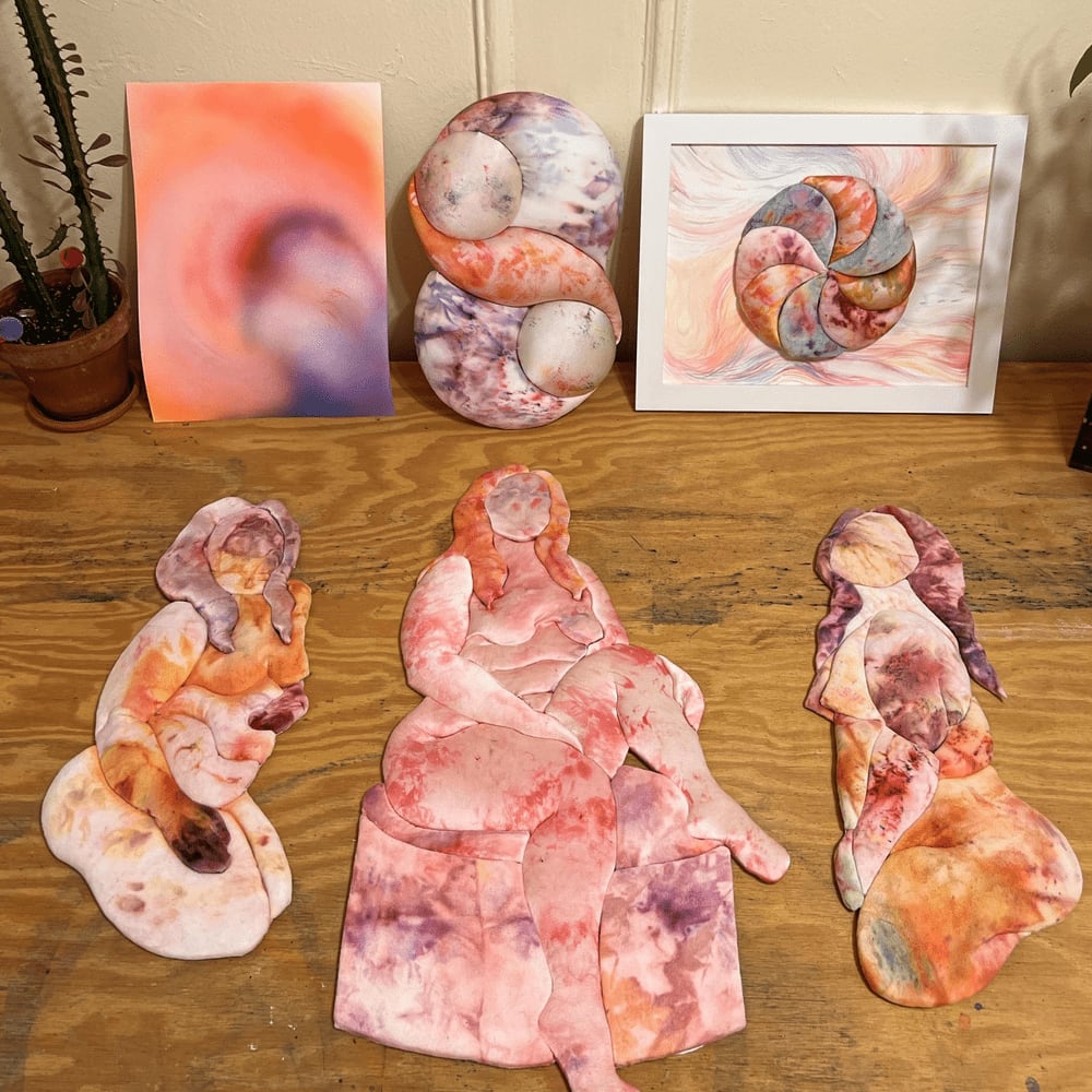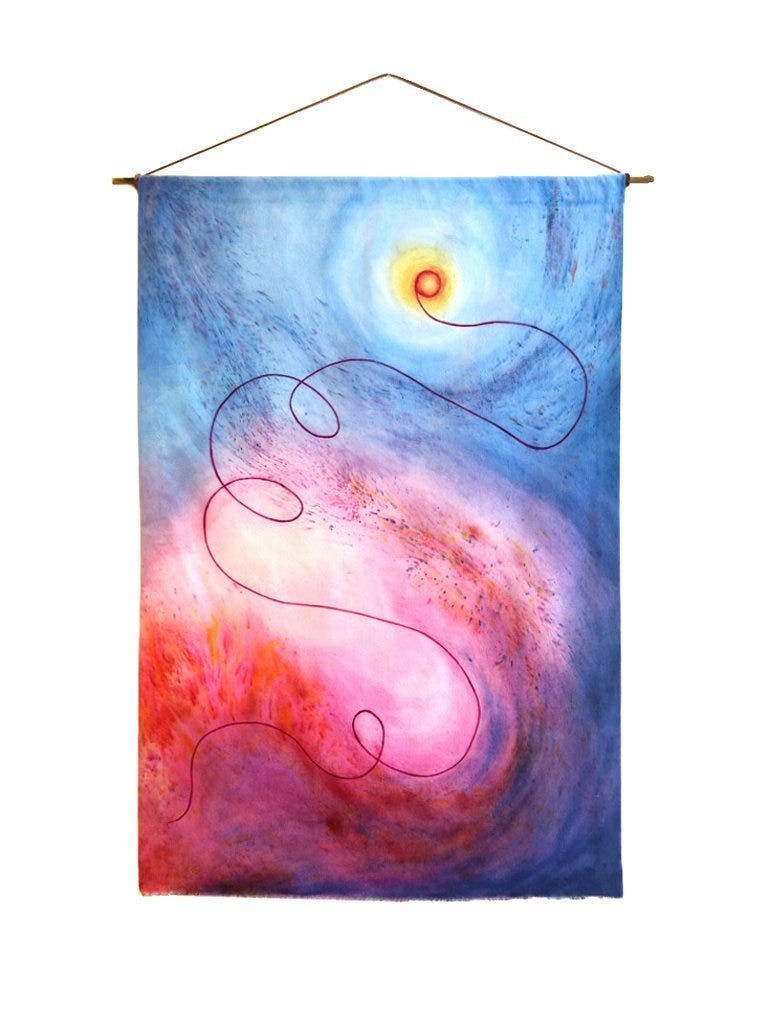 Lynne Rutherford is an Irish, Scottish Artist living in Brooklyn, New York. She creates energetic portals with her velvet paintings, textile sculptures and collage work. Bright, bold expressions of color course through her work, complimenting the fine layers of detail in each piece. She welcomes the viewer into these worlds that capture movement, time, and feeling, each artwork hinting at all the mysterious possibilities that lie beyond us and within us.