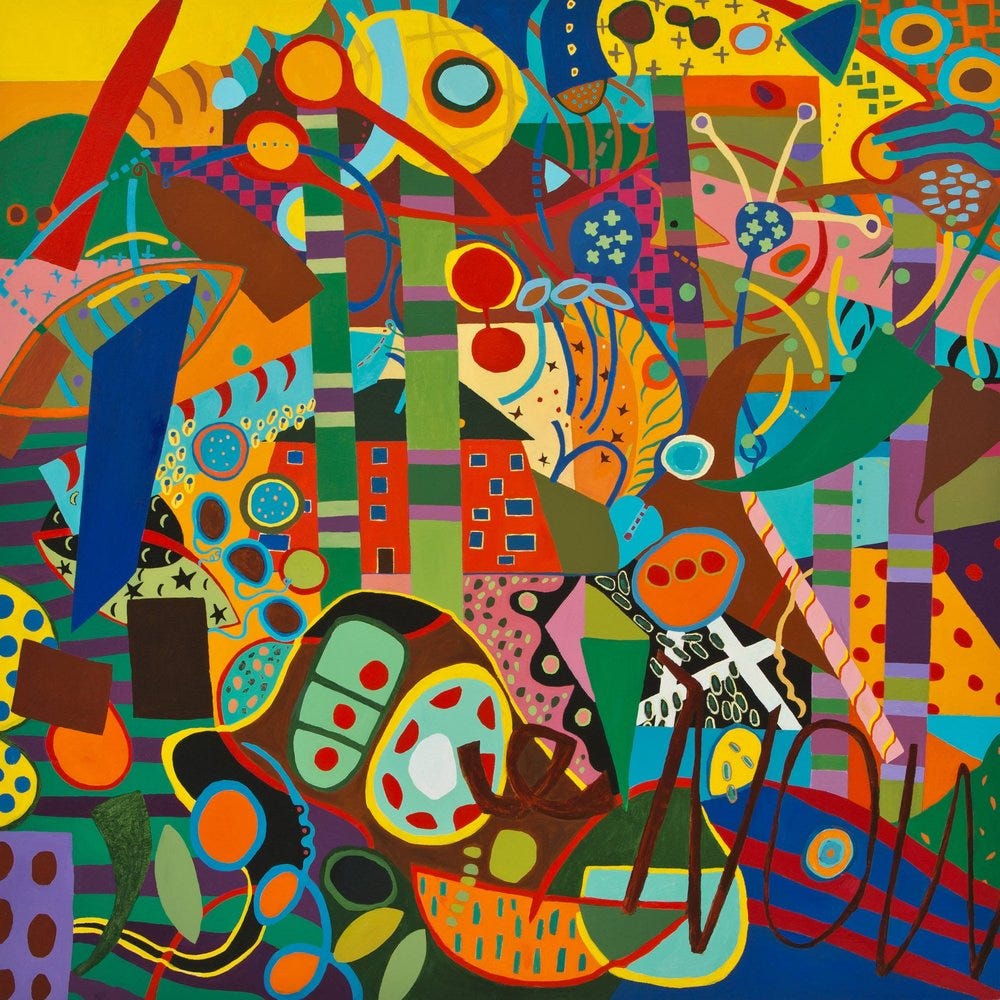 Many of her paintings are like puzzle pieces-often holding disparate vignettes together, each part connected to the whole. Myra strives to contain the often chaotic energy, creating areas of calm and reflection. The artist loves to imbue the work with an ironically cheerful color palette, challenging the viewer to move beyond the carnival-like colors to discover the underlying conceptual underpinnings of the work.