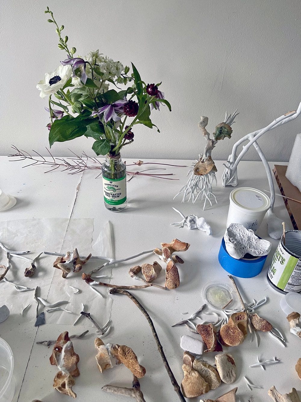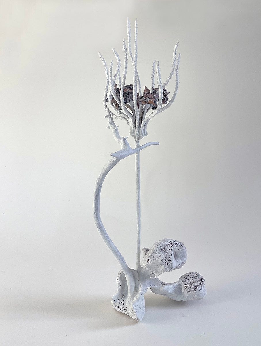 Noémie Jennifer Bonnet is a French-born artist based in New York. She rearranges animal bones that were discarded as industrial waste, invasive plants, and sculpted elements into organism-like objects both familiar and alienating. Born of dead fragments, reaching toward new life, the sculptures' references to the fungal, botanical, and animal worlds maintain an ambiguity anchored in the realm of the unknowable. In their fusion of gloom and whimsy, they coalesce into an ecological “danse macabre” for our era.